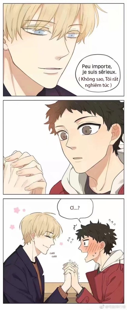 Hôm nay lên lớp, có một anh chàng người Trung Quốc nói với tiểu soái ca người Pháp là đưa cậu ta xem chỉ tay cho. Cậu bạn người Trung Quốc dùng ngón tay của mình vân vê trong lòng bàn tay của cậu bạn kia. Sau đó cười nói: Thực ra tớ không biết xem đâu, tớ đùa cậu tí thôi. Và cậu bạn đẹp trai người Pháp kêu cậu ta xoè cả bàn tay ra, rồi luồn bàn tay của mình vào, nhẹ nhàng nói: Peu importe, je suis sérieux (Không sao, tớ là nghiêm túc).