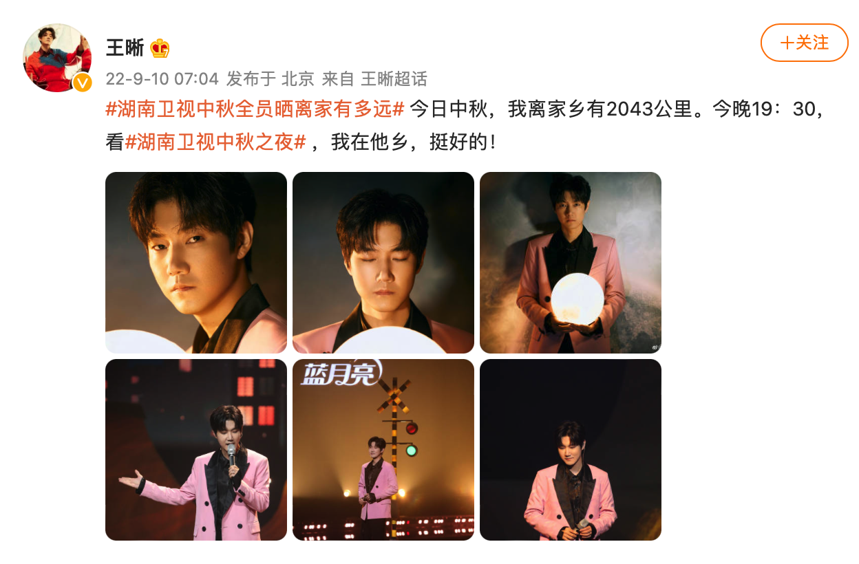 Weibo: #湖南卫视中秋全员晒离家有多远# 今日中秋,我离家乡有2043公里。今晚19:30,看 #湖南卫视中秋之夜# ,我在他乡,挺好的!