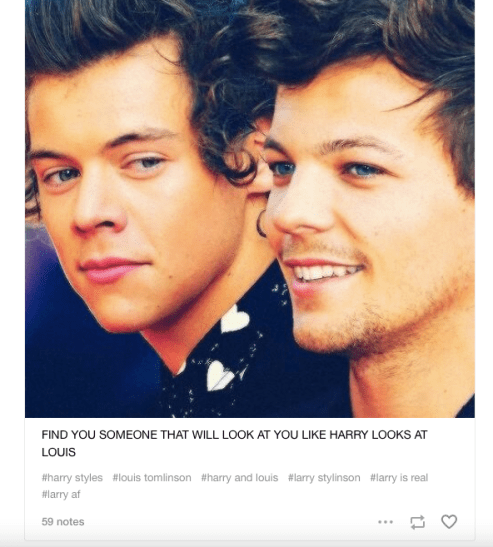 Một số fan One Direction xem tình cảm này là một dấu hiệu hiển nhiên cho hơn cả tình bạn. Blogger giấu tên đằng sau Sex at Oxbridge, một chiếc blog buôn dưa lê nổi tiếng được vận hành bởi một sinh viên tuổi đôi mươi ở London, bị cuốn vào chiếc thuyền Larry vào năm 2013, hoàn toàn tình cờ và chính bằng sức mạnh của sự tương tác của Styles và Tomlinson dành cho nhau. Trao đổi với Vox qua email, tác giả blog – được biết đến trên mạng với cái tên duy nhất SAO – nói rằng cô ấy đã rất shock khi nhận ra họ không phải là một đôi thật sự: