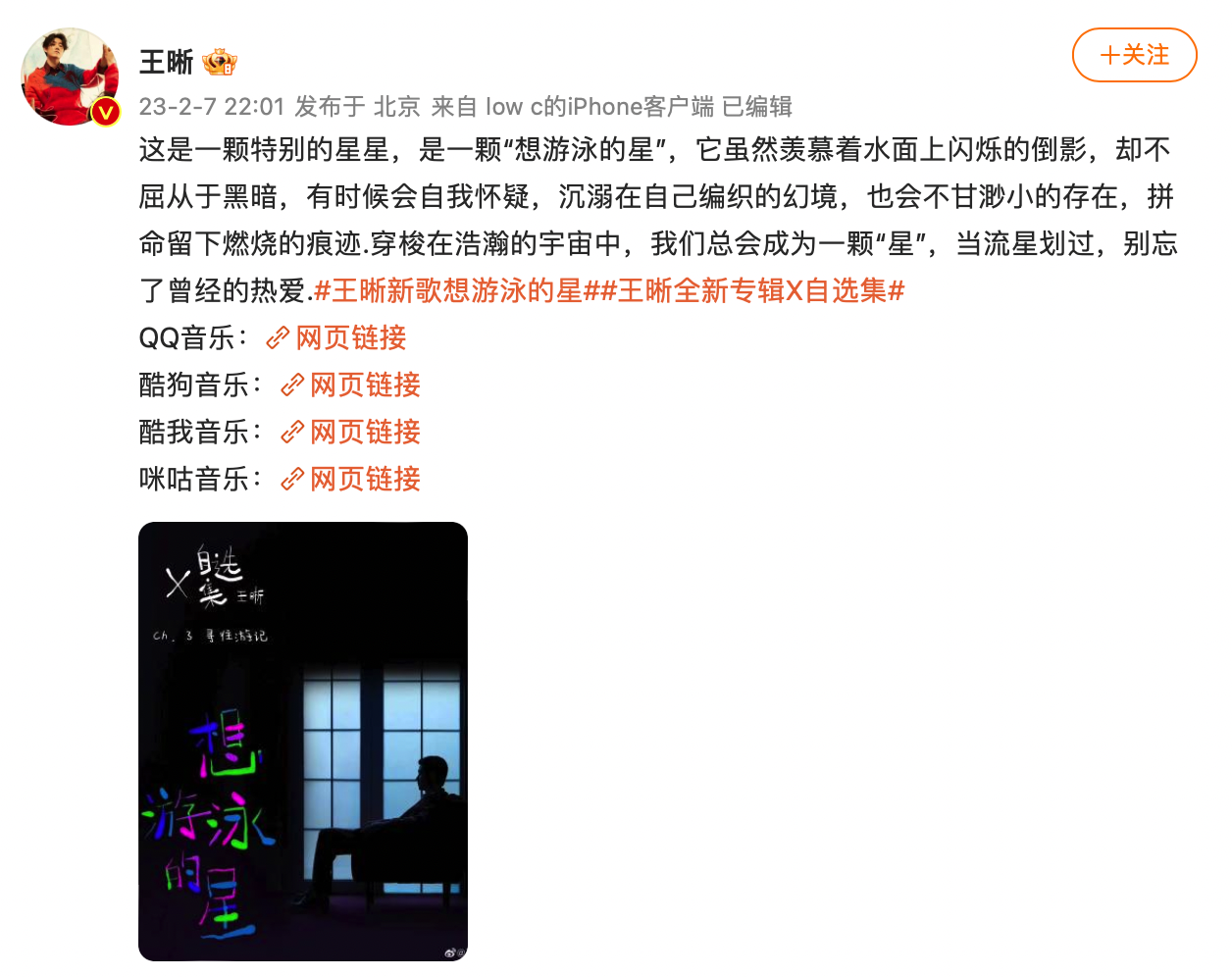 Đây là một ngôi sao đặc biệt, một “ngôi sao muốn bơi lội”. Tuy nó hâm mộ hình bóng phản chiếu lóng lánh trên mặt nước nhưng cũng không khuất phục bóng tối. Đôi khi nó hoài nghi bản thân và chìm đắm trong ảo ảnh do chính mình dệt nên, và cũng biết không cam lòng với sự tồn tại bé nhỏ của mình, liều mình để lại dấu vết từng bùng cháy. Băng qua đại dương tinh tú bao la, mỗi chúng ta đều sẽ trở thành một vì “sao”. Khi sao băng lướt qua, đừng quên tình yêu đã từng nồng nàn. #Bài hát mới của Vương Tích “Ngôi sao muốn bơi lội” #Album mới của Vương Tích Chuyên tập X