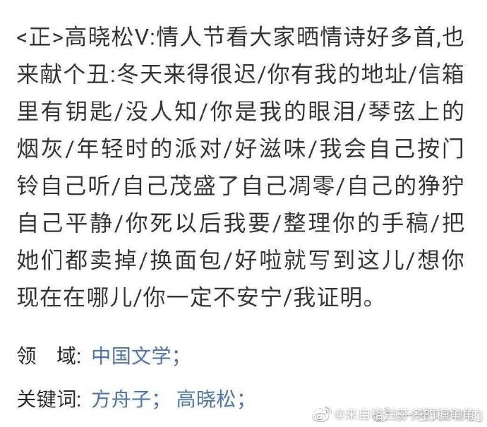 Cao Hiểu Tùng V: Valentine thấy mọi người đăng thật nhiều bài thơ tình, tui cũng lên góp vốn: Mùa đông đến thật muộn màng/ Người có địa chỉ của tôi/ Trong hòm thư có chìa khoá/ Mà không một ai hay/ Người là giọt lệ của tôi/ Lớp bụi trên dây đàn/ Bữa tiệc thời trẻ/ Mùi vị thật tuyệt/ Tôi sẽ tự nhấn chuông cửa tự lắng nghe/ Tự đâm chồi nảy lộc rồi tự điêu tàn/ Tự hung dữ tự bình tĩnh/ Sau khi người qua đời tôi muốn/ Sửa sang lại bản thảo của người/ Bán hết đi/ Đổi bánh mì/ Được rồi chỉ viết đến đây thôi/ Nghĩ không biết giờ người đang ở nơi nào/ Người chắc chắn sẽ không bình yên/ Tôi sẽ chứng minh.