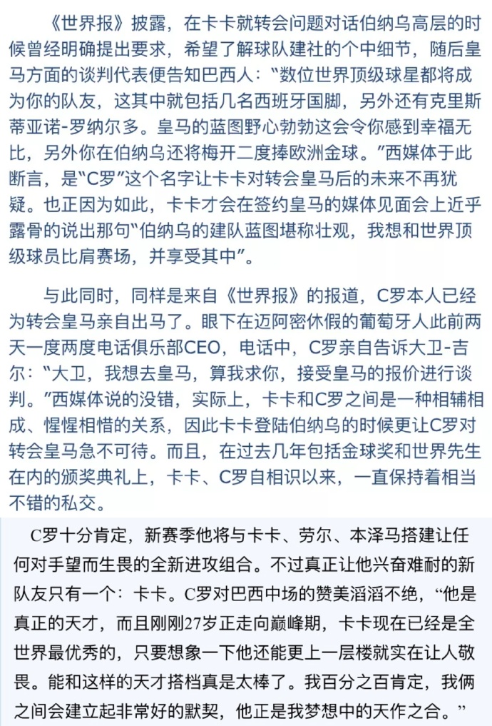 Đồng thời, tờ Le Monde cũng đưa tin rằng chính Ronaldo đã đích thân ra tay chuyển nhượng sang Real Madrid. Cầu thủ người Bồ Đào Nha hiện đang đi nghỉ ở Miami đã gọi điện cho Giám đốc điều hành câu lạc bộ hai ngày trong hai ngày qua, trong cuộc điện thoại, Ronaldo đã đích thân nói với David Gill: “David, tôi muốn đến Real Madrid. Xem như tôi cầu xin anh, nhận báo giá của Real Madrid và tiến hành đàm phán.”, truyền thông phương Tây nói. Đúng vậy, trên thực tế, Kaka và Ronaldo có mối quan hệ “đôi bạn cùng tiến”, “tinh tinh tương tích” với nhau. Vì vậy, khi Kaka cập bến Bernabeu, Ronaldo càng nóng lòng muốn chuyển đến Real Madrid. Hơn nữa, tại các lễ trao giải bao gồm Quả cầu vàng và Mr. World trong vài năm trở lại đây, Kaka và Ronaldo vẫn duy trì mối quan hệ cá nhân rất tốt kể từ khi gặp nhau.