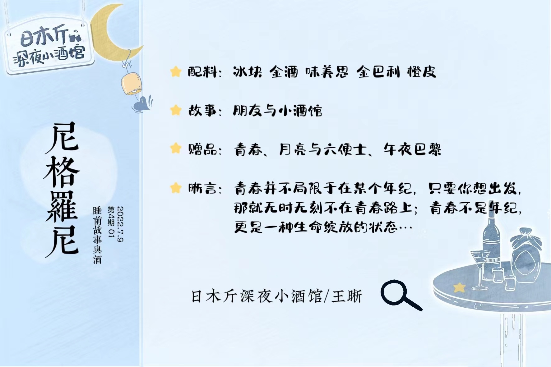 Sau khi anh chia sẻ xong câu chuyện này, tôi cố ý gọi cho anh ấy một ly Negroni. Đây là một ly rượu vừa ngọt vừa đắng; uống vào rồi sẽ thấy sau khi cái đắng tan đi là vị ngọt dịu dàng, sẽ làm người ta trở nên bình yên hơn. Bạn tôi nói khi nhấm nháp Negroni thì phải thong thả trải nghiệm quá trình ba loại vị riêng dung hợp vào nhau ở trong miệng, không được vội vàng, phải toàn tâm toàn ý tập trung vào hiện tại, cũng giống như cuộc đời. Về sau người bạn này của tôi về quê mình là một thành phố nhỏ phương Nam; ban ngày làm giáo viên trường công, nghề tay trái là sáng tác nhạc bán thời gian và đi hát ở quán bar anh ấy thích, thù lao chính là những tác phẩm đặc biệt của các bartender. Anh nói rất nhiều người uống rượu là để quên mất những điều không vui, nhưng chung quy bọn họ đều không dám hạnh phúc, còn tôi bây giờ mỗi một ngụm uống vào đều là vì niềm vui. Anh nói anh rất may mắn, nhờ một bài “Thanh xuân” mà gặp được một người, hiểu được ý nghĩa của hai chữ “thanh xuân”.