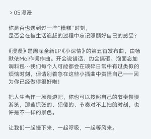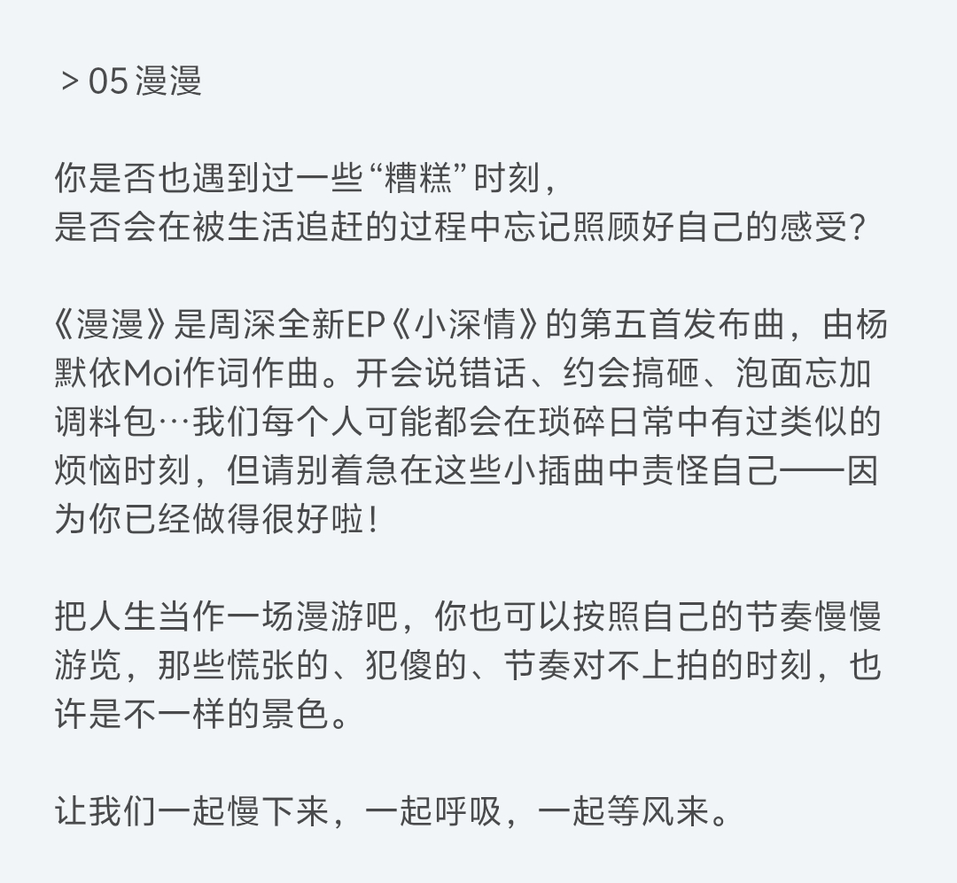 《 Chầm chậm 》 là ca khúc chính thức thứ năm trong EP《 Chút tình Thâm 》 hoàn toàn mới của Châu Thâm, do Moi Dương Mặc Y sáng tác và viết lời. Khi họp nói sai lời, làm hỏng buổi hẹn hò, nấu mì gói quên cho gói gia vị . . . Có thể mỗi người chúng ta đều từng có những khoảnh khắc muộn phiền tương tự trong cuộc sống vụn vặt hằng ngày, nhưng xin đừng vội trách cứ bản thân vì những điều nhỏ nhặt này —— Bởi vì bạn đã làm rất tốt rồi!