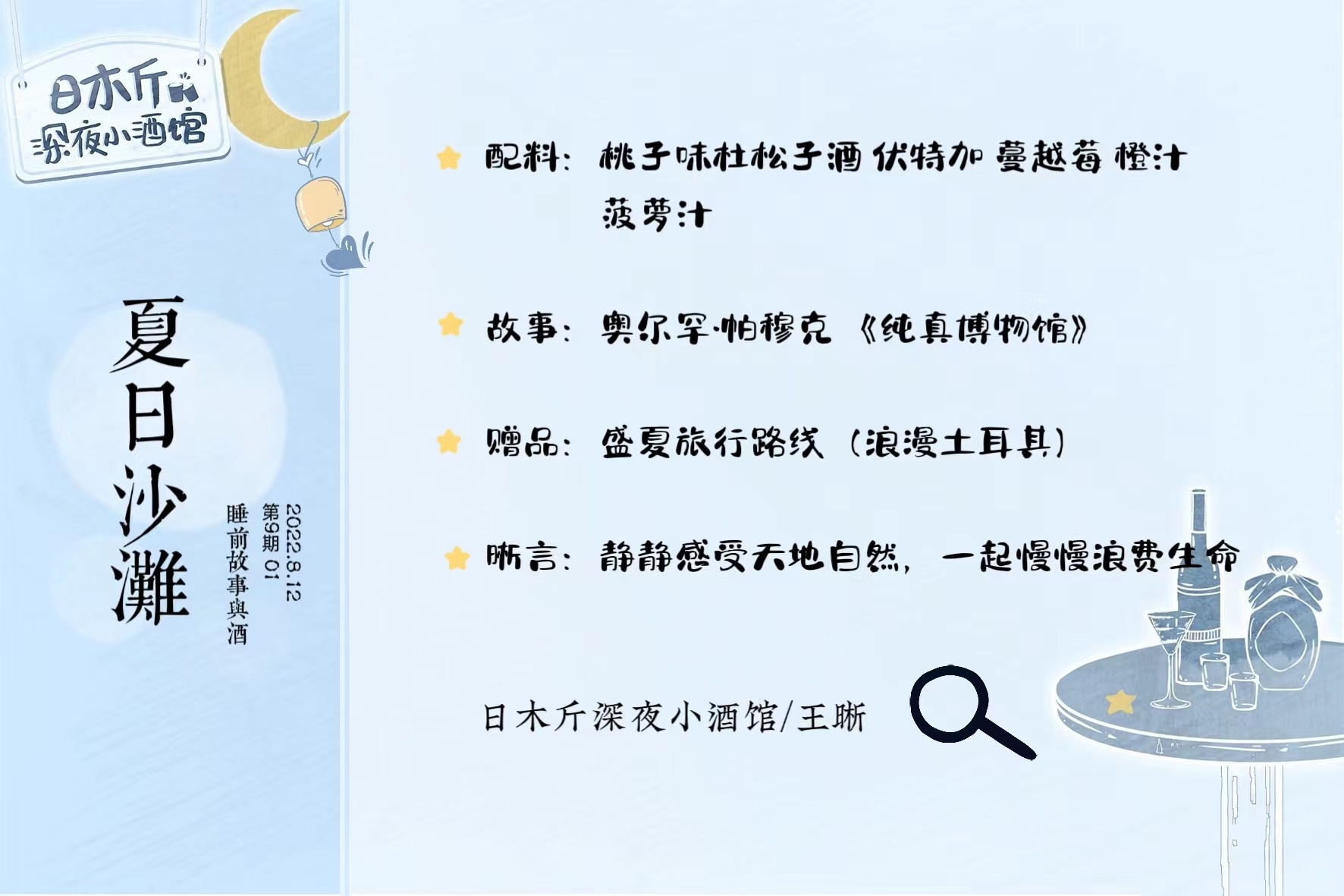 Thức uống mà tôi chuẩn bị cho bạn tối nay đương nhiên là một món cocktail không thể thiếu trong những chuyến du lịch mùa hè. Nguyên liệu của món nước này rất phong phú, hơn nữa màu sắc cũng thật đẹp, mang lại cảm giác rất “hè”. 45ml rượu gin đào, 45ml rượu vodka, 60ml nam việt quất, 60ml nước cam và 60ml nước ép thơm. Sau đó chúng ta cho tất cả vào bình lắc rồi lắc đều. Ừm ~ được rồi, tôi còn cần một chiếc ly highball nữa, và cắt thêm một miếng cam. Xem này, có phải màu này có cảm giác rất mát mẻ khoan khoái không? Chậc, đừng vội nhé, cam chưa làm xong đâu. Nè, Bãi biển mùa hè vừa lãng mạn vừa nồng nhiệt, xin mời bạn thưởng thức. Thế nào, bạn nhấm nháp nó, có cảm thấy như đang trong một chuyến đi giữa mùa hè không? Vậy tối nay hãy đi với tôi đi, chúng ta hãy cùng nhau thực hiện một chuyến đi ngẫu hứng với tiếng đài radio bên tai.