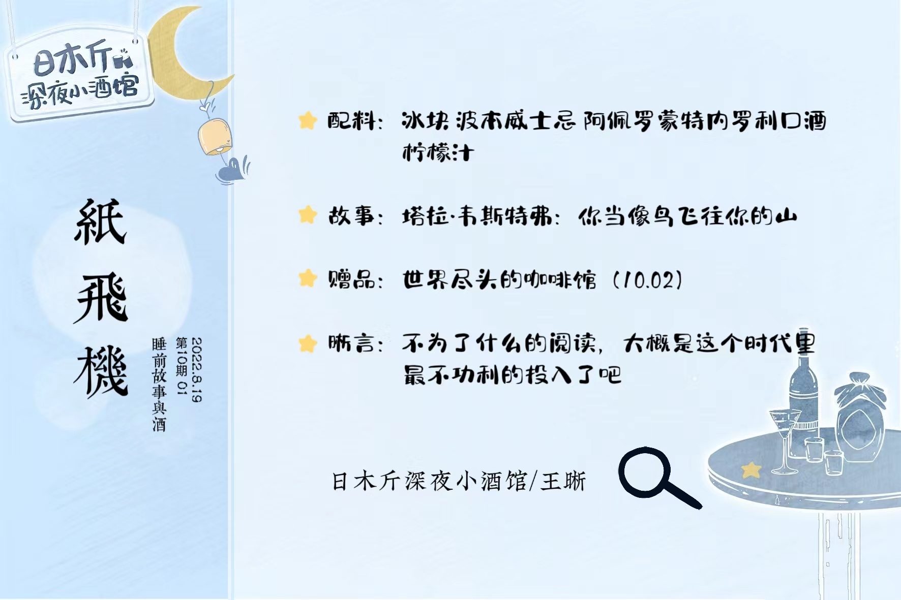 Ly rượu hôm nay có tên là “Máy bay giấy” [“Paper Plane”], có phải bạn đã lập tức ngân nga câu “Chiếc máy bay giấy thuở ấu thơ, bây giờ bay trở về trong bàn tay tôi” không, câu hát này cũng có liên quan đến câu chuyện tối nay đấy. Khoan hãy nói đã, nào, để tôi pha cho bạn một ly trước nhé. Ly rượu cocktail kinh điển này được ra đời năm 2007 tại Chicago nước Mỹ. Vì có nguyên liệu đơn giản, tỷ lệ dễ nhớ, cho nên dù là tay mới cũng có thể làm ra những ly hương vị không tệ. Đầu tiên, cho vào ly cocktail một lượng nước đá vừa phải, sau đó chúng ta lần lượt cho 30ml rượu bourbon, Aperol, Montenero và nước chanh tươi vào bình lắc, khuấy đều. Sau khi lắc đều, đổ qua rây vào chiếc ly ướp lạnh đã chuẩn bị lúc nãy. Cuối cùng, thêm một chiếc máy bay giấy trang trí cho ly rượu, vậy là đã xong rồi đấy. Nào, mời thưởng thức. Sao, có phải hương vị rất độc đáo không, thật giống như bạn đang nghiền ngẫm một quyển sách vô cùng đặc biệt, hấp dẫn và khó quên.